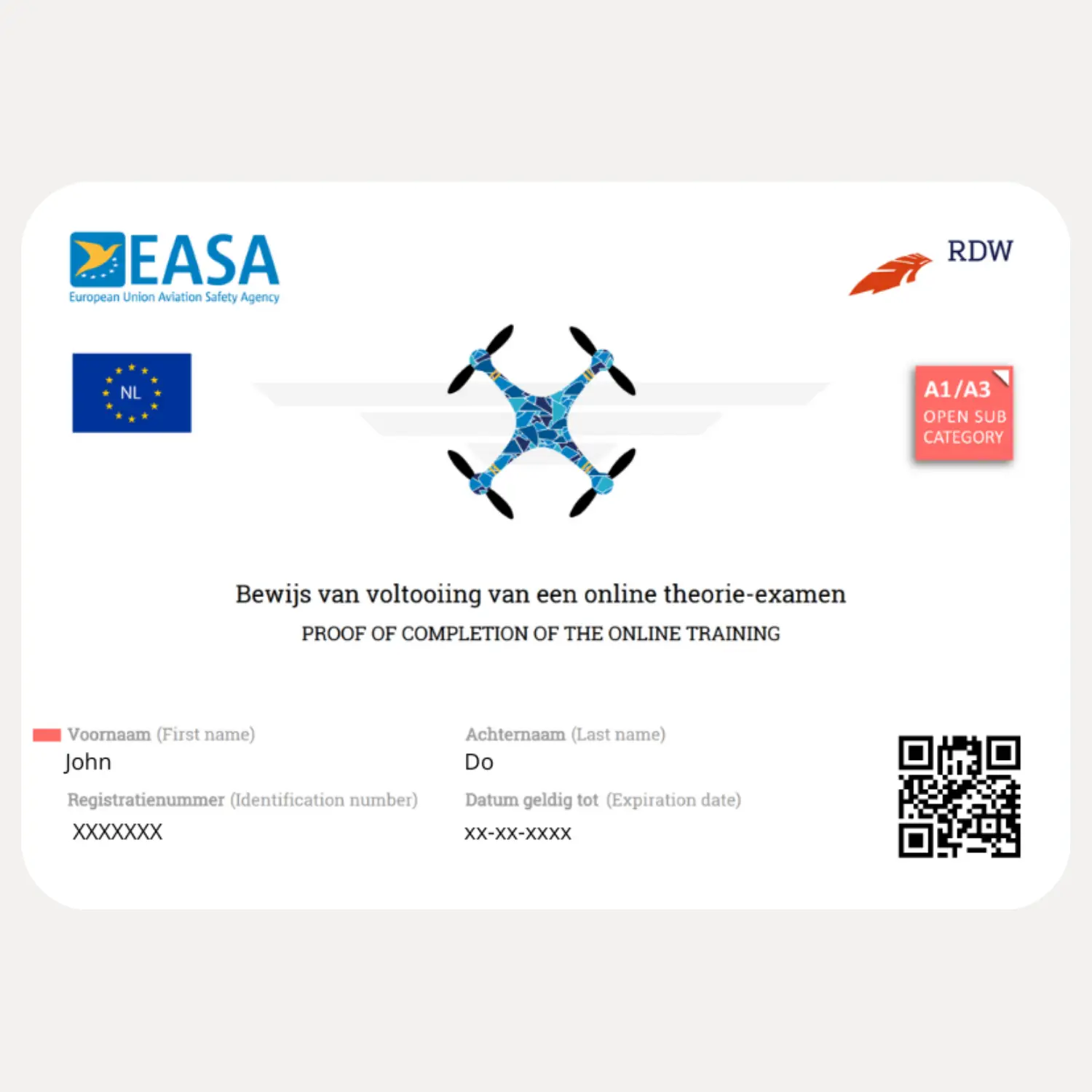 Tip: Heb jij je A1/A3 bewijs gehaald en ben je van plan om binnenkort ook je A2 bewijs te halen. Wacht dan nog even met bestellen van de dronepas. Op je A2 certificaat staat namelijk ook je A1/A3. Ben je na je A2 bewijs ook nog van plan om de Specific opleiding te volgen, wacht dan ook nog even met bestellen. Op het Specific certificaat staat ook het A1/A3 en A2 bewijs.